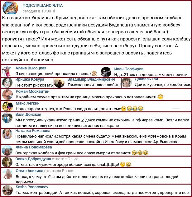 14. “Я сыр санкционный провозила в вещах” — жители Ялты делятся лайфхаками, как с материковой Украины провезти в оккупированный Крым продукты. Все сообщения прочтите по ссылке