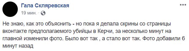 »Не знаю, как это объяснить, но пока я делала скрины со страницы «ВКонтакте» предполагаемого убийцы в Керчи, за несколько минут на главной изменили фото. Было вот так, а стало вот так. Фото добавили 6 минут назад», − написала она.