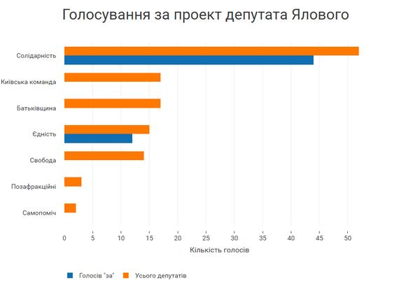 З фракції «Солідарність» проект підтримали усі присутні депутати на момент голосування, окрім секретаря Київради Володимира Прокопіва (не голосував), а також екс-заступника голови КМДА Іллі Сагайдака (утримався). Всі інші фракції та групи, а також позафракційні депутати не дали жодного голосу «за».