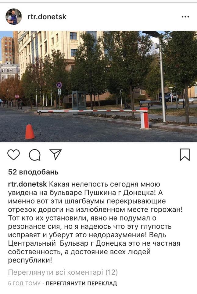 В Донецке перекрыли шлагбаумом бульвар Пушкина. Это самый центр города. Всю жизнь был свободный проезд, а теперь только для избранных – для новой МММ-элиты. Даже регионалы себе не позволяли такого хамства.