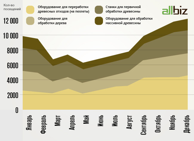 В целом же, к деревообрабатывающему оборудованию, как показывает следующая статистика, проявляется большой интерес, который к концу года превысил даже показатель января-февраля (что стало исключением, в сравнении с другими отраслями):