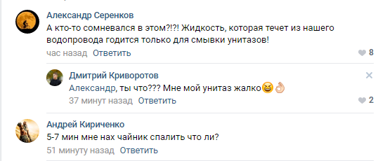«А кто-то сомневался в этом!!! Жидкость, которая течет из нашего водопровода годится только для смывки унитазов!».