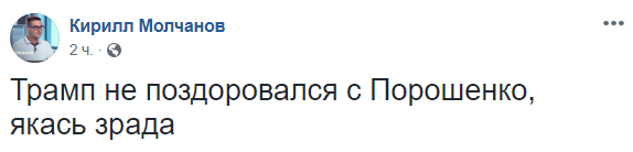 «Трамп не поздоровался с Порошенко, якась зрада», – пишет политолог Кирилл Молчанов. «То был переодетый Путин», – шутит Кирилл Молчанов..
