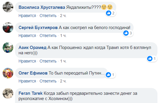 Игнорирование Порошенко «другом Украины» Трампом активно обсуждают в социальных сетях. Пользователи Facebook с издевкой отмечают, что «рабов не замечают», что такое поведение Трампа – это «зрада». При этом некоторые шутят, что у Порошенко еще есть шанс поздороваться с Трампом – возле туалета.