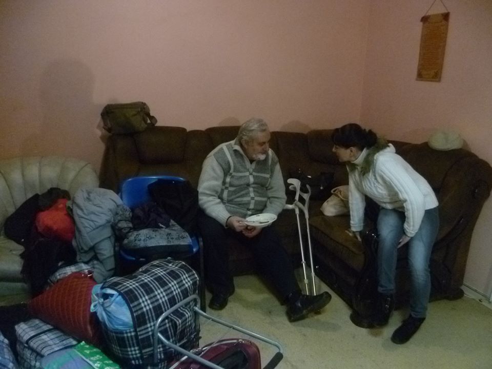 Еще одно невероятное чудо – все 33 человека согласилась принять группа Восток-Киев-Помощь под руководством Андрея Лапенюка. Об Андрее можно говорить много, но сегодня – это было что-то. Я смогла дозвониться его помощнице Алле уже по дороге на вокзал, проезжая ст. м. Днепр. А через 2 часа люди уже находились в теплом помещение и ели горячий обед. Потом была поездка в паспортный стол с теми, кто без документов, 2 кареты скорой помощи для тех, кому нужно удалять осколки после ранений, валидол-корвалол, работа группы психологов с детьми и взрослыми, поход в банк и много чего еще. Поражает многогранность человеческой души – с одной стороны сеем смерть и разруху, с другой бросаем все и мчимся поддержать жизнь!