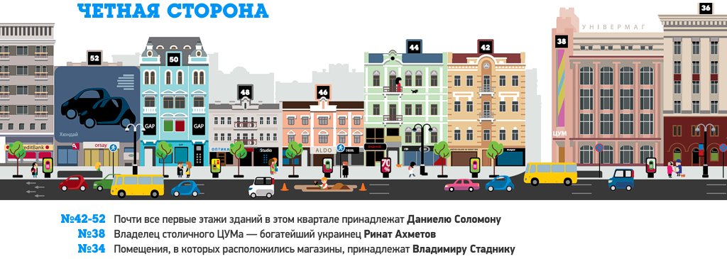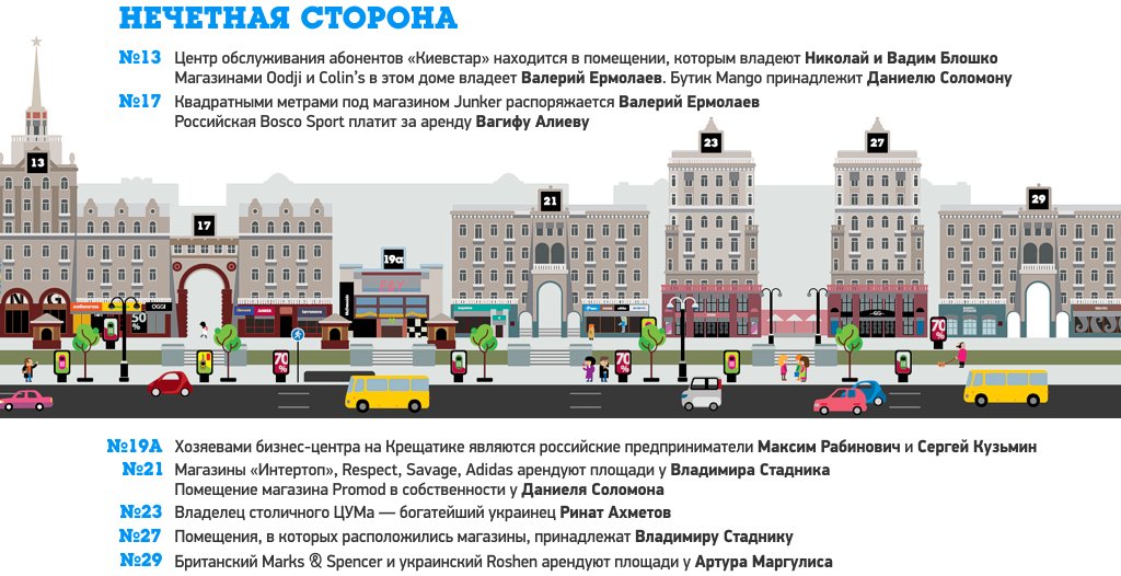 Журналистка издания Forbes.ua Нина Мищенко провела в прошлом году детальное расследование того, кому принадлежит коммерческая недвижимость на главной улице Украине - Крещатике. За это время мало что изменилось, разве лишь то, что Майдан понизил доходы «регионалов».