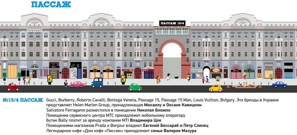 Если на Крещатике квадратные метры «золотые», то в Пассаже они «платиновые». Именно здесь максимальные арендные ставки в Украине  – $3000 в год за 1 кв. м. Среди элитных рантье  – уже упоминавшийся Соломон, которому принадлежит магазин Fashion Club. Основатель компании MTI Владимир Цой владеет помещением, в котором открыт бутик Bally. Несколько магазинов в Пассаже, включая Prada,  – у компании «Лига-инвест», принадлежащей девелоперам Петру Слипцу и Евгению Бессарабу.