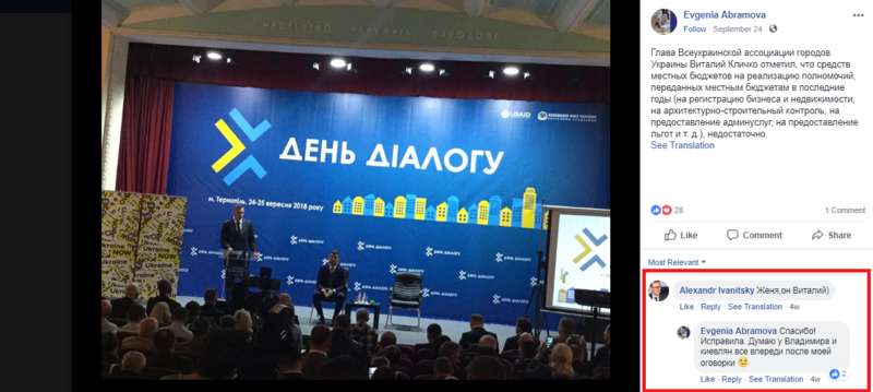 В 79-м избирательном округе баллотировалась руководитель Департамента предоставления административных услуг Евгения Абрамова. В Одесском облсовете она возглавляет депутатскую комиссию по вопросам бюджета, финансово-экономической политики и банковской деятельности. На своей странице в Facebook Абрамова пишет об участии в «Дне диалога», который состоялся в Тернополе, спутав Виталия Кличко с Владимиром. После замечания она исправила ошибку, назвав ее «оговоркой».
