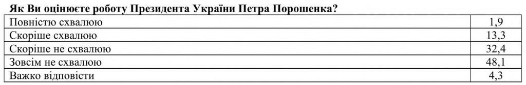 Большинство опрошенных (80,5%) в той или иной степени не одобряет работу Петра Порошенко на посту Президента Украины. Положительно оценивают работу Порошенко ("полностью одобряют" или "скорее одобряют") 15,2% респондентов. По сравнению с октябрем, уменьшилась доля положительных оценок (с 16,1 до 15,2%), и одновременно выросла доля негативных (с 79,4 до 80,5%).