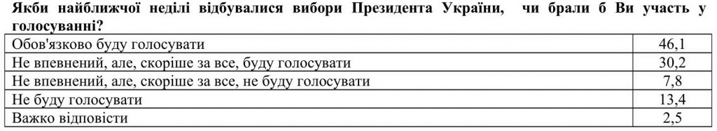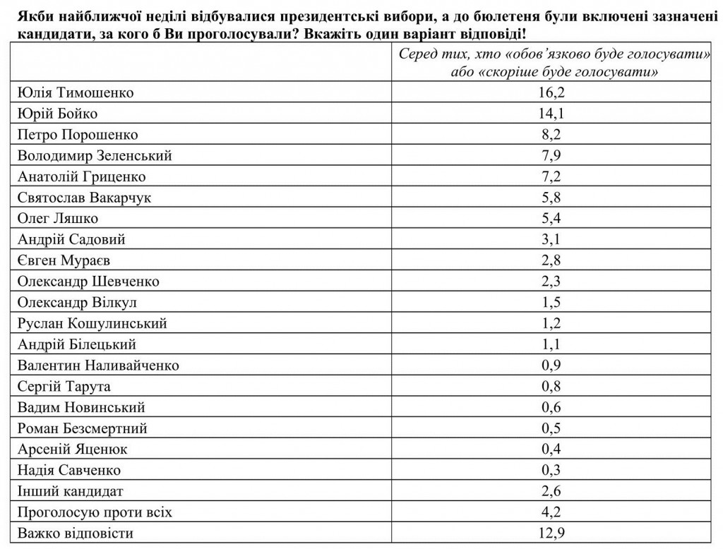 Если бы на момент опроса проходили президентские выборы, то наилучшие шансы выйти во второй тур имели бы Юлия Тимошенко и Юрий Бойко. Среди респондентов, которые будут участвовать в выборах, за Тимошенко намерены проголосовать 16,2%, за Бойко - 14,1%.