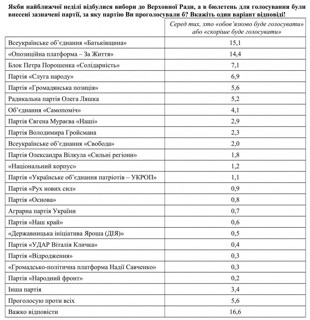 Если бы на момент опроса проходили парламентские выборы (голосование по партийным спискам), то лучшие шансы преодолеть 5-процентный барьер должны “Всеукраинское объединение “Батькивщина” (15,1%), “Оппозиционная платформа - За Жизнь” (14,4%), Блок Петра Порошенко "Солидарность" (7,1%), партия "Слуга народа" (6,9%), партия “Гражданская позиция” (5,6%), “Радикальная партия Олега Ляшко” (5,2%) .