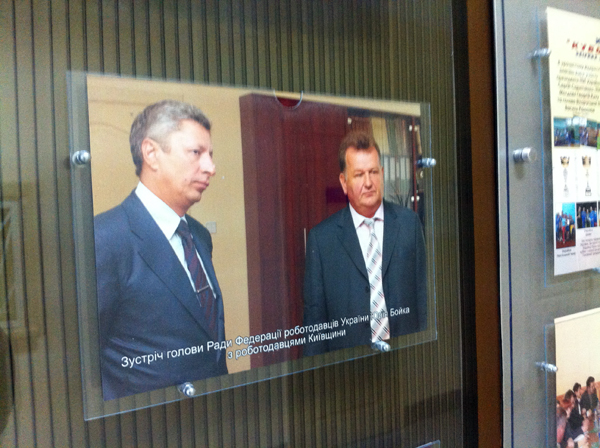 Як відомо, головою Федерації роботодавців України є Дмитро Фірташ, тому така зміна позицій одного з місцевих керівників зовсім не здивувала. Додатково, на другому поверсі будівлі місцевого осередку ФРУ, на центральному стенді находиться наступне фото.