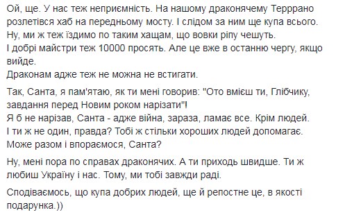 Его опубликовал Глеб Бабич в Facebook. “Пишет тебе мальчик Глеб – 49 лет, с 10 горно-штурмовой бригады. Не поверишь, в этом году снова буду просить подарки для разведки. Потому что под новый год хочется чего-то совсем хорошего. Разведка весь год вела себя хорошо. Потому что враг говорит, что очень плохо. Согласись – лучшая рекомендация”, – написал он.