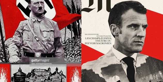 Французская газета Le Monde разместила на обложке президента Эммануэля Макрона в стиле Адольфа Гитлера: изображение французского лидера было в 3/4 на красном и белом фоне, а буква “M” в названии журнала набрана готическим шрифтом, который часто использовали нацисты.