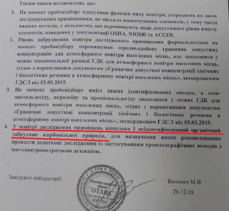 Щоб з’ясувати, що ж так впливає на людей, броварські медики звернулися до хімічної лабораторії науково-сервісної фірми «Отава», де проводять комплексне обстеження повітря. Після замірів та проведених аналізів спеціалісти зробили висновок: «Рівень забруднення повітря дослідженого приміщення формальдегідом (безбарвний подразнюючий газ із характерним різким запахом – авт.) на момент прововідбору перевищував середньодобову гранично допустиму концентрацію для атмосферного повітря населених місць, але знаходиться у межах максимальної разової ГДК для атмосферного повітря населених місць, згідно з нормативним документом «Гранично допустимі концентрації хімічних і біологічних речовин у атмосферному повітрі населених місць», затвердженим ГДСЛ від 03.03.2015 р.». Однак найбільше стурбував медиків у висновку 4 пункт, де вказано, що «у повітрі досліджених приміщень виявлено один неідентифікований органічний забрудник карбонільної (отруйної – авт.) природи». Щоб з’ясувати, що ж саме отруює головного лікаря , спеціалісти лабораторії рекомендували провести додаткові дослідження «із застосуванням хроматографічних методів із мас-спектрометричною детекцією». Тобто, якісний хімічний аналіз.