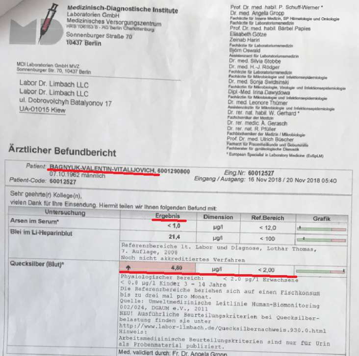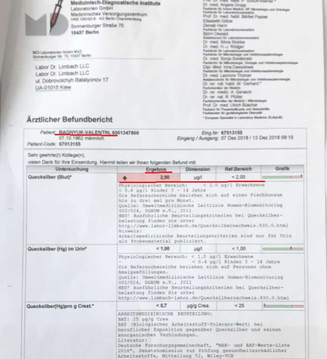Останні кілька місяців головний лікар перебував на лікарняному і з’являвся на роботі лише час від часу. Усі 4 місяці, каже Валентин Багнюк, постійно лікувався, а його кров двічі перевіряли в лабораторії Німеччини. Аналіз виявив у крові пацієнта вдвічі перевищені показники ртуті. І це після того, як тричі було проведено плазмофорез (очищення крові – авт.)