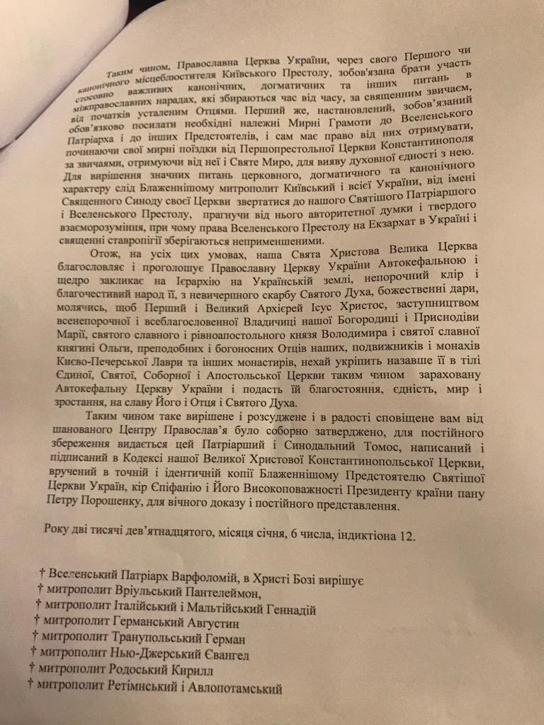 В документе в частности отмечается: "... Наша Святая Христова Большая Церковь благословляет и провозглашает Православную Церковь Украины Автокефальной... Такое решено... и в радости возвещено вам от уважаемого Центра Православия было соборно утверждено, для постоянного сохранения выдается этот Патриарший и Синодальный Томос, написанный и подписанный в Кодексе нашей Великой Константинопольской Церкви Христовой, врученный в точном и идентичной копии Блаженнейшему предстоятелю Святейшей Церкви Украины, корь Епифанию и Его Высокопревосходительству Президенту страны господину Петру Порошенко, для вечного доказательства и постоянного представления. Года две тысячи девятнадцатого, месяца января, 6 числа, индиктиона 12".