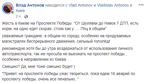 Кроме того, по информации от Влада Антонова, утром в районе метро Шулявская за короткий отрезок времени произошло 16 дорожно-транспортных происшествий.