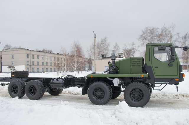 “Самоходное шасси, грузоподъемностью 27 т, предназначенное для монтажа тяжелого спецоборудования. От своих предшественников он отличается более мощным – 460 л.с. – двигателем и автоматической коробкой передач, максимальный крутящий момент которого рассчитан на 2500 Н / м. Такое агрегатирования совместно с проходной трансмиссией позволяет реализовать высокие тягово-динамические характеристики автомобиля. Также по требованию заказчика выхлопная система размещена между 1 и 2 мостами с выхлопом на правую сторону по ходу движения автомобиля, а вместо двух топливных баков прямоугольной формы по 350 л установлены два по 165 л круглого сечения”, – говорится в сообщении.