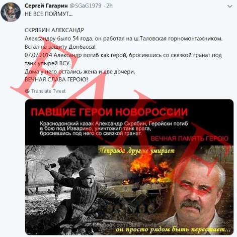 В интернете пропагандисты в очередной раз выставляют ложную историю, где говорится о смерти “героя ЛНР”, который якобы бросился с гранатами под танки ВСУ. Также в фейковой новости отмечают, что погибшему было 54 года и он “встал на защиту Донбасса”.