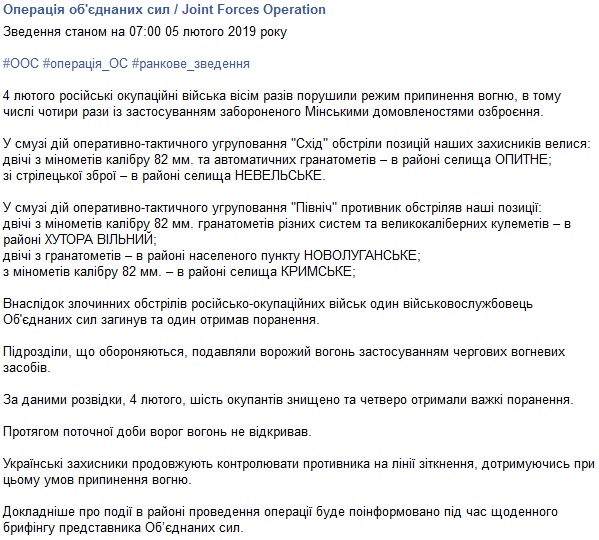 «4 февраля российские оккупационные войска восемь раз нарушили режим прекращения огня, в том числе четыре раза с применением запрещенного Минскими договоренностями вооружения», — говорится в сообщении штаба на странице Facebook.