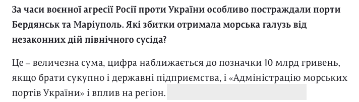 В чем конкретно пострадали, какие 10 млрд. грн потерь, когда грузооборот наших азовских портов с их долей под 10% всей портовой переработки Украины уменьшился в пределах этих аж 10% падения, но в общем доход и прибыль налогоплательщика из первой десятки крупнейших в Украине, т.е. АМПУ, упала на 16-17% по всем портам совокупно! Доработались... Под нескончаемые сказки о концессиях, о новых инвестициях от каких-то жаждущих инвестировать в наш транспорт западных, арабских и китайских инвесторах...