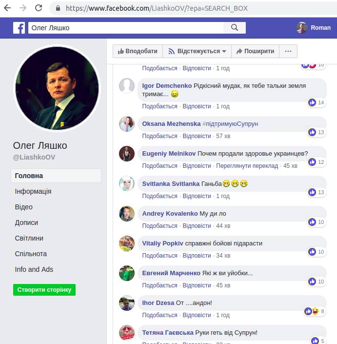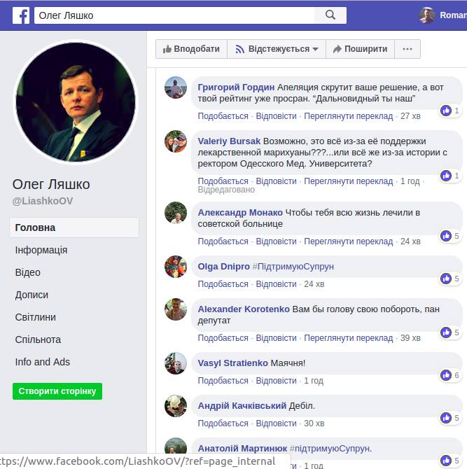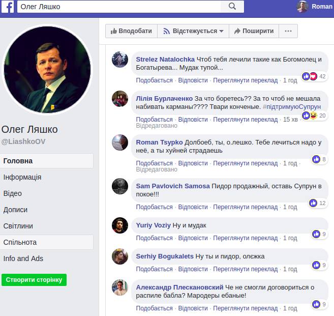 На странице лидера «Радикальной партии» Олега Ляшко исчезают комментарии, в которых пользователи выступают в поддержку отстраненной и. о. главы Минздрава Ульяны Супрун.