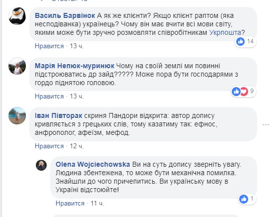 “Когда в сентябре 2015 году операторку отделения связи-186 (Укрпошта) в Киеве Язову Елену уволили за дискриминацию меня по языковому признаку. С тех пор все работники пытались обслуживать меня на украинском языке. Однако, некоторые уволились и на их место взяли тех, кто не только не владеет государственным языком, но и не считает нужным учить его”, – пишет она.