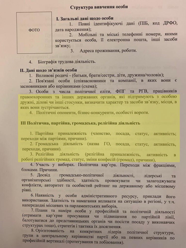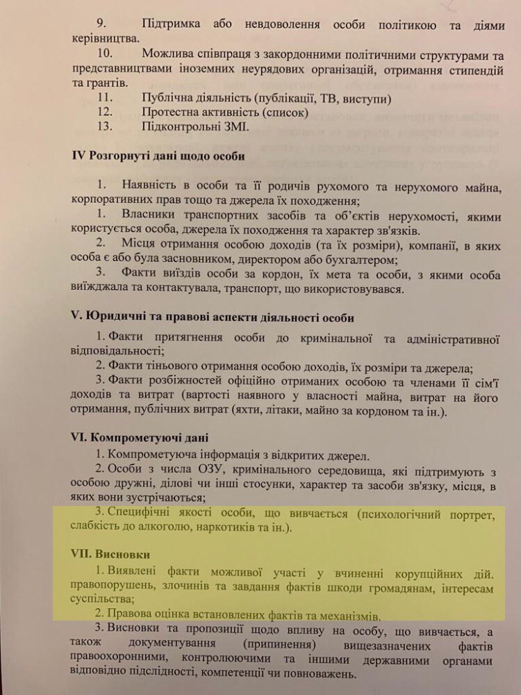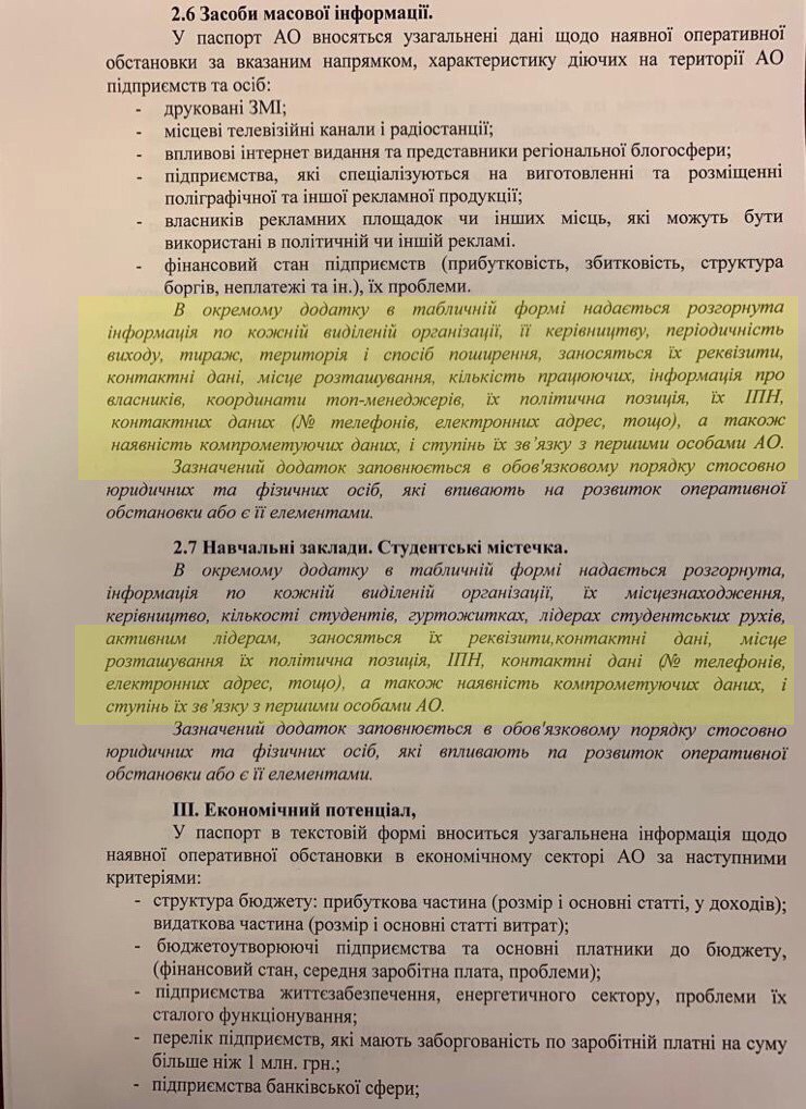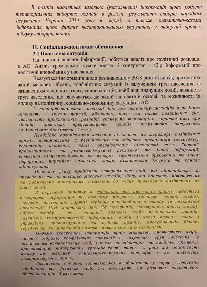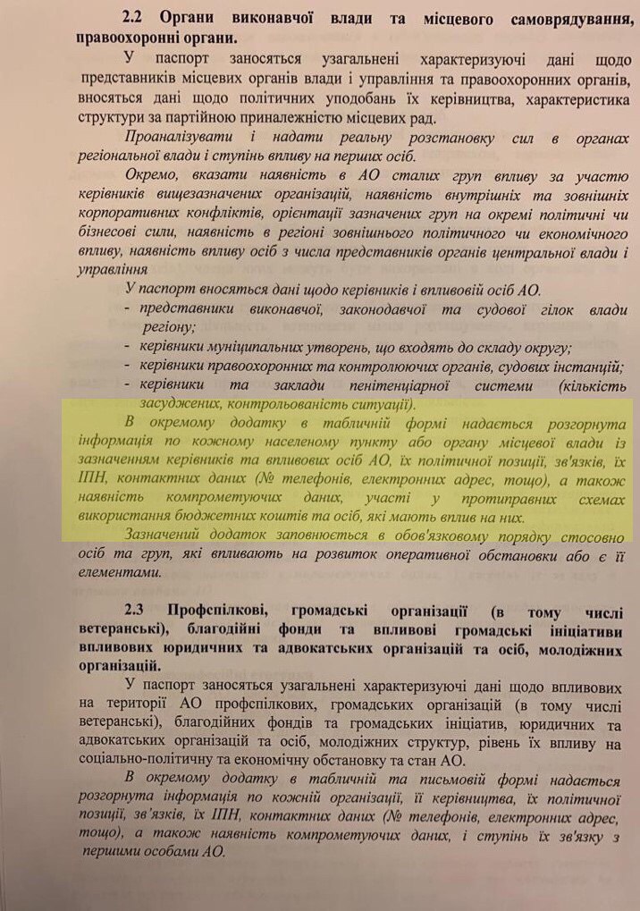 При аналізі політичної ситуації в регіонах обов`язковим є надання інформації щодо керівників штабів, політичних організацій та партій, а також компрометуючої інформації щодо них. Обов`язковим є збір компрометуючих даних щодо власників та топ-менеджерів засобів масової інформації. Козловський не оминув увагою навчальні заклади, студентські містечка, їх керівництво та лідерів студенстьких рухів, щодо яких теж є вказівка по збору персональних даних та компрометуючої інформації. В окремих додатках повинна надаватися розгорнута інформація по кожному населеному пункту або органу місцевої влади із зазначенням керівників та впливових осіб, їх політичної позиції, зв`язків, контактних даних, а також компрометуючих даних та можливості впливу на них. Те саме стосується профспілкових та громадських організацій, благодійних фондів та впливових громадських ініціатив, впливових юридичних та адвокатських організацій, молодіжних організацій. Компрометуючі дані слід шукати навіть на церковних діячів та представників духовенства. Окремим додатком йде документ під назвою «Структура вивчення особи», де пункт VI називається «Компрометуючі дані».