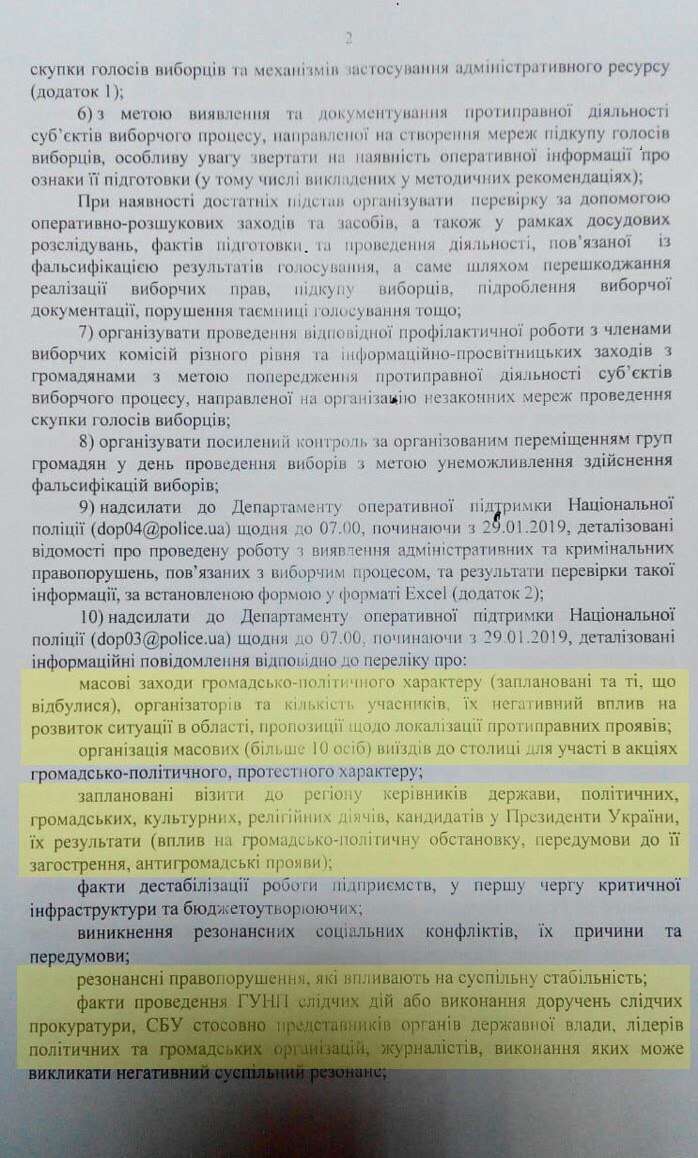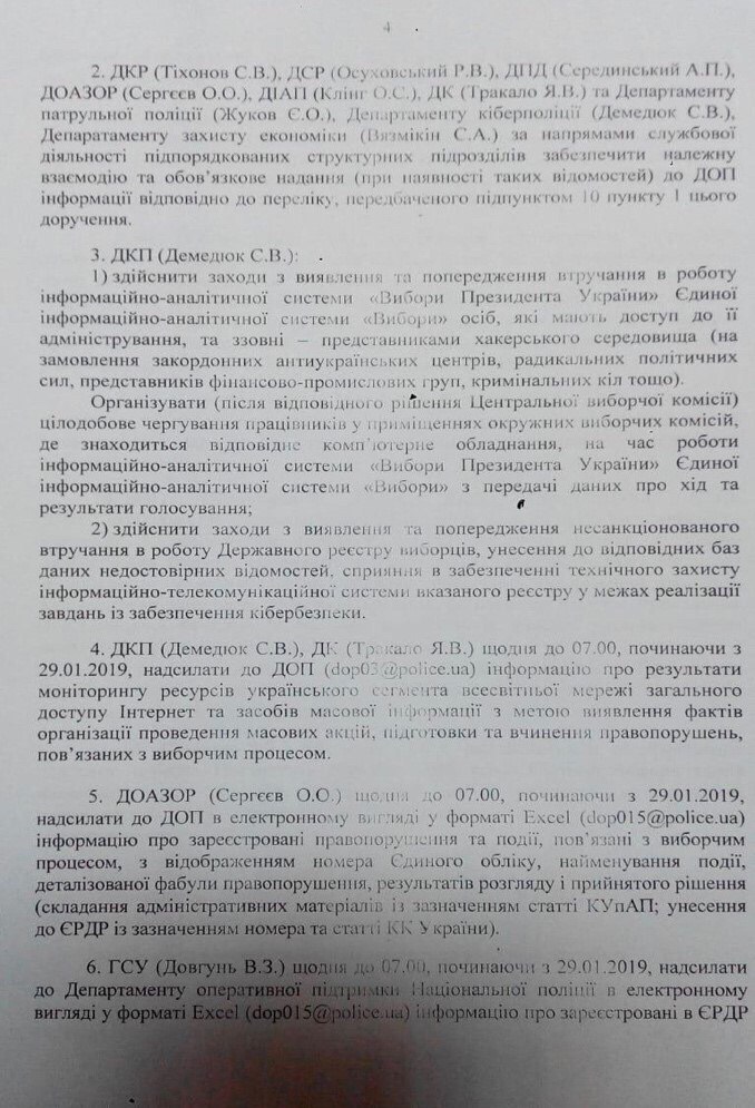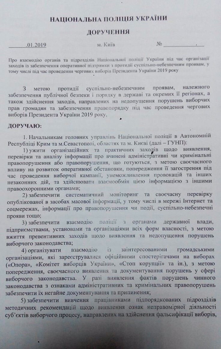 Так, до рук журналістів потрапив проект доручення «Про взаємодію органів та підрозділів Національної поліції України під час організації заходів із забезпечення оперативної підтримки з протидії суспільно-небезпечним проявам, у тому числі під час проведення чергових виборів Президента України 2019 року», підготований О.Козловським.