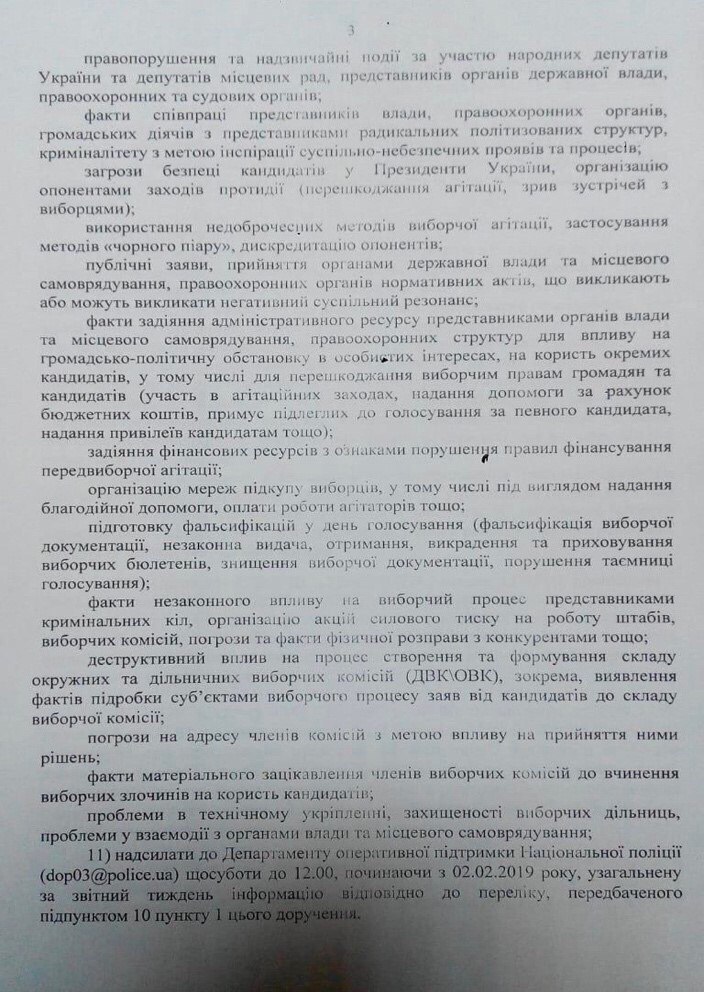 Із змісту доручення стає зрозумілим, що Департамент оперативної підтримки, яким керує О.Козловський, стає в системі МВС центром по збору інформації та прийняття рішень з усіх питань, які стосуються виборів Президента України 2019 року. Згідно цього доручення, з 29 січня 2019 року, вся інформація, яка стосується політичного і громадського життя країни, має щоденно скеровуватися на електронні поштові скриньки Департаменту оперативної підтримки «[email protected]», «[email protected]» та «[email protected]». Серед відомостей, щодо яких О.Козловському підрозділи Нацполіції щоденно мають надсилати деталізовані інформаційні повідомлення є наступні: