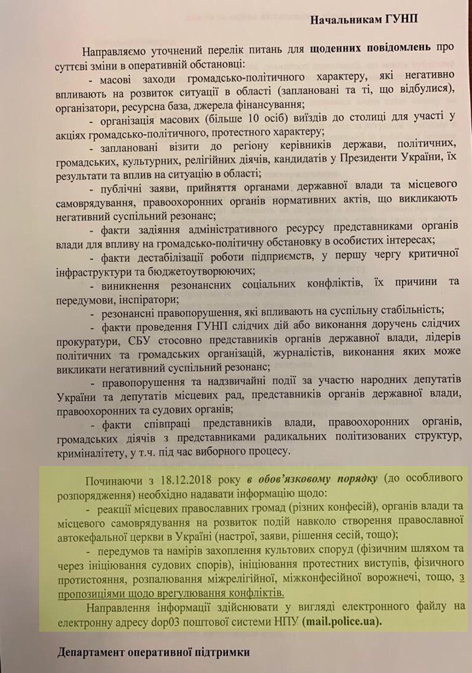 Зокрема, Олега Козловського з 18 грудня 2018 року дуже цікавить все, що відбувається в церковному житті країни. В обов’язковому порядку він зобов’язав начальників ГУНП надавати інформацію щодо: місцевих православних громад (різних конфесій), органів влади та місцевого самоврядування на розвиток подій навколо створення православної автокефальної церкви в Україні (настрої, заяви, рішення сесій тощо); передумов та намірів захоплення культових споруд (фізичним шляхом та через ініціювання судових спорів), ініціювання протестних виступів, фізичного протистояння…, з пропозиціями щодо врегулювання конфліктів. Враховуючи той факт, що Юрій Тандіт, про близькість до якого Олега Козловського ми вже загадували, неодноразово пробував через засоби масової інформації відбілювати імідж російської церкви та її представників в Україні, збір такої інформації Департаментом оперативної підтримки не може не викликати занепокоєння. А з огляду на те, що отримання Україною Томосу та створення Української Православної Церкви є одним з важливих пунктів програми діючого Президента і основного конкурента Юлії Тимошенко на виборах Петра Порошенка, стає зрозумілим, чому Департамент Козловського так цікавиться церковним життям.
