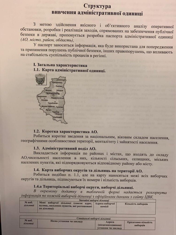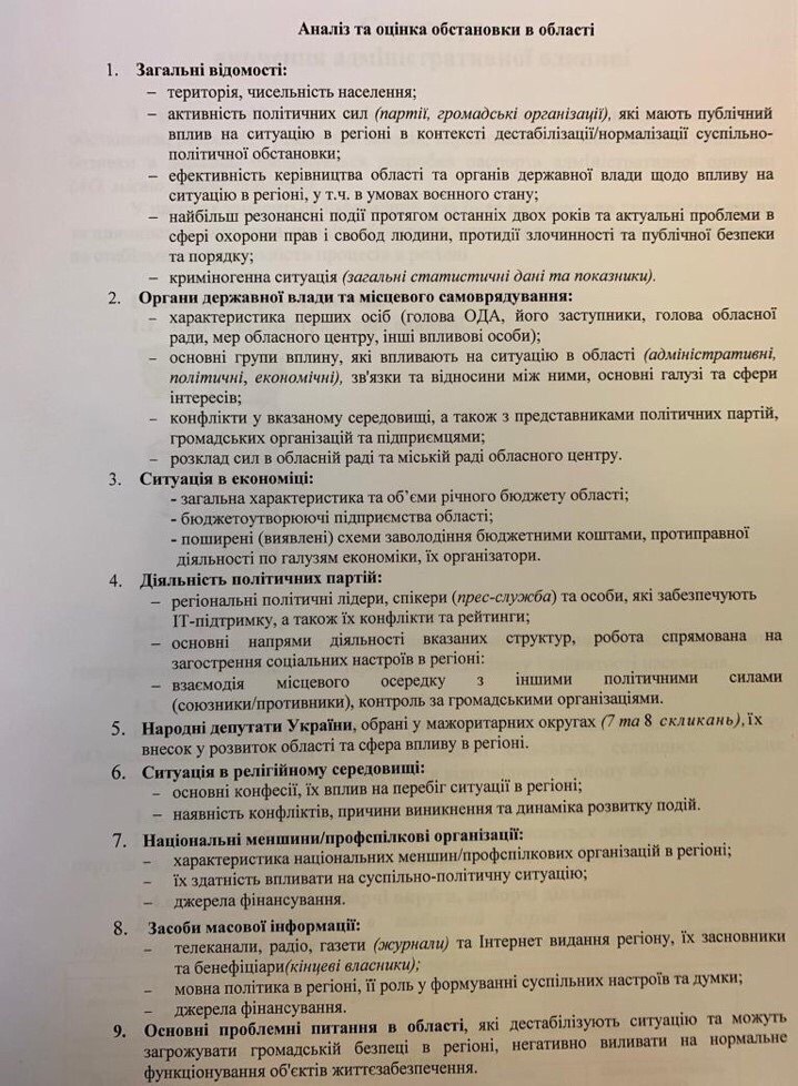 Департамент Козловського вимагає інформацію про все, що може вплинути на хід виборів і впливає на електоральні настрої населення регіонів. При аналізі та оцінці обстановки в областях Департамент оперативної підтримки має бути поінформований щодо: характеристики перших осіб в регіоні; основних груп впливу, які впливають на ситуацію в області (адміністративні, політичні, економічні), зв’язки та відносини між ними, основні галузі та сфери інтересів; конфлікти у вказаному середовищі, а також з представниками політичних партій, громадських організацій та підприємцями; розклади сил в обласній раді та міській раді обласного центру.