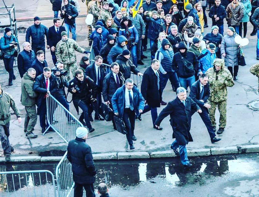Протестные возгласы стихли, когда люди совместно спели гимн. Его вместе исполнили и сторонники Порошенко и протестующие.
