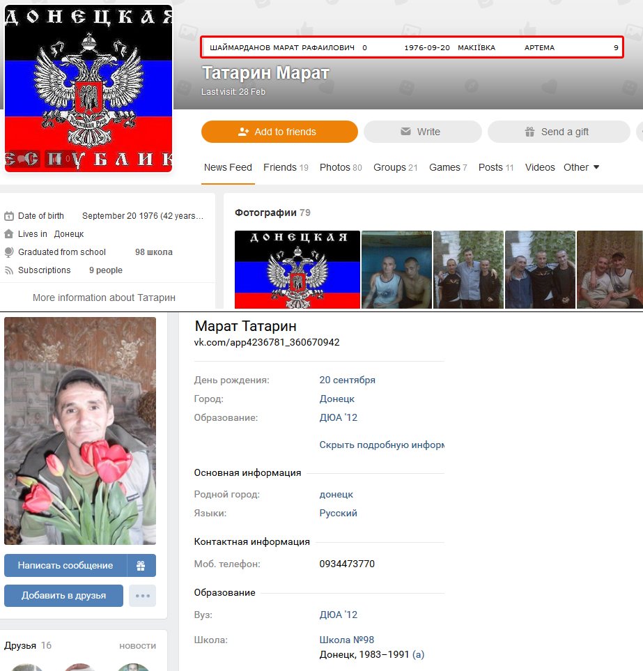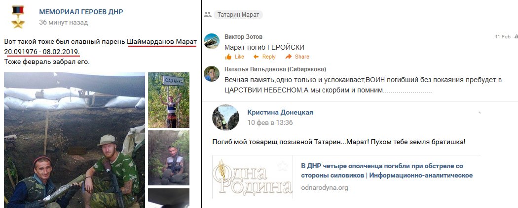 “Шаймарданов Марат Рафаилович “Татарин” (Макеевка, 20 сентября 1976 года) погиб 8 февраля 2019 года в блиндаже в районе населеного пункта Ленинское (Приазовье)”, – написал он.