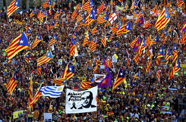 Демонстранты, многие из которых прибыли из северо-западной части Каталонии, размахивали каталонскими флагами и держали плакаты с надписью "Самоопределение не является преступлением"