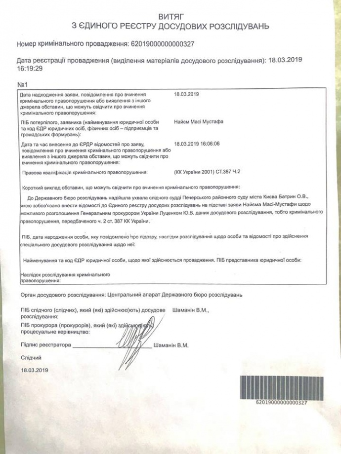 28 февраля Печерский районный суд г. Киева вынес решение: удовлетворил жалобу Маси Найема на бездействие следователей и обязал последних зарегистрировать уголовное производство. В тот же день суд направил в ГБР копию этого постановления с сопроводительным письмом.