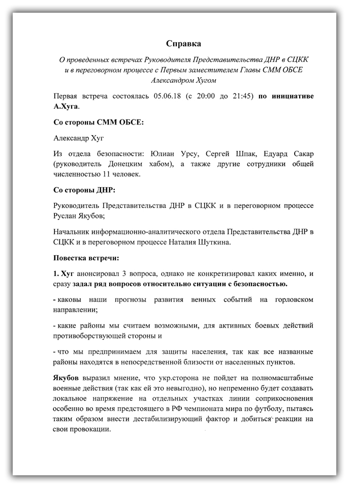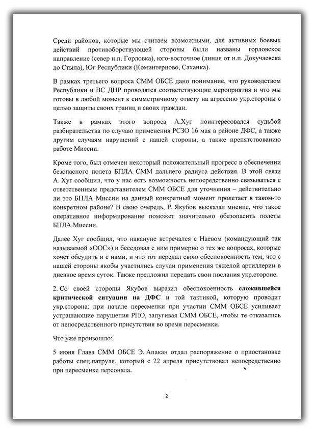 Природно, про усі свої розмови, офіційні та неофіційні зустрічі з працівниками ОБСЄ, про успіхи в своїй кампанії з дезінформування міжнародних спостерігачів, Руслан Вахітов регулярно доповідає в російський Генштаб. Одна з таких доповідей про результати зустрічі Вахітова з Хугом у червні 2018 року опинилася у нашому розпорядженні.