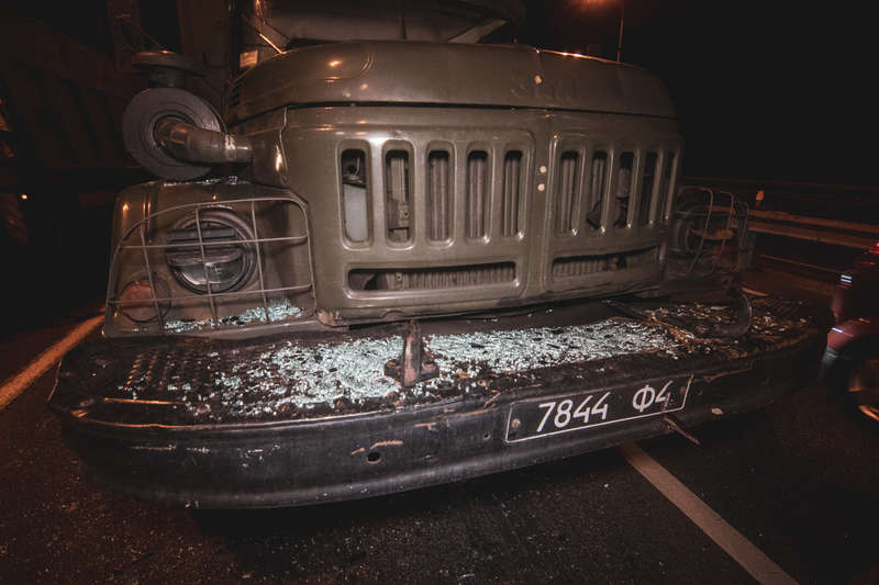 Инцидент произошел около 22:30 на Гаванском мосту. На средней полосе движения столкнулись военный грузовик и автомобиль Chevrolet. По данным очевидцев, грузовая машина влетела в легковушку сзади. По предварительной информации, причиной столкновения стали неисправные тормоза в военном авто.