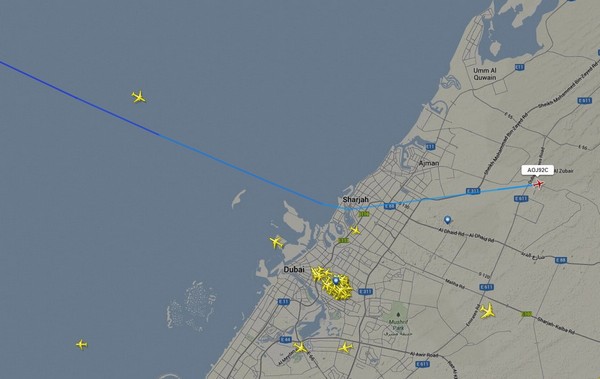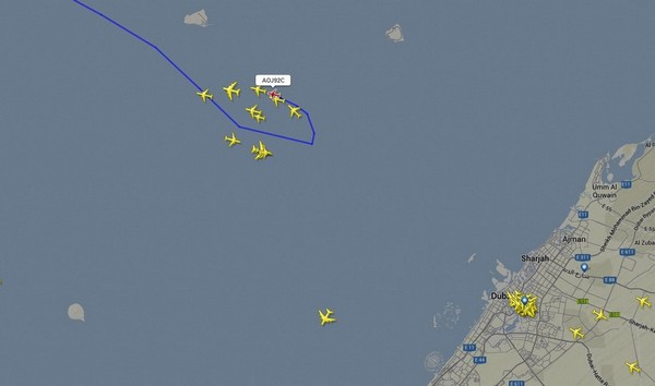 UPD2: Самолет продолжает наматывать круги, на посадку в Дубай небольшая пробка. Максимальная дальность полета у этого самолета при полных баках топлива примерно 6000 км, на данный момент самолет преодолел почти 4000 км. Еще пару часиков такого хоровода, и овощ окунется в Персидский залив.