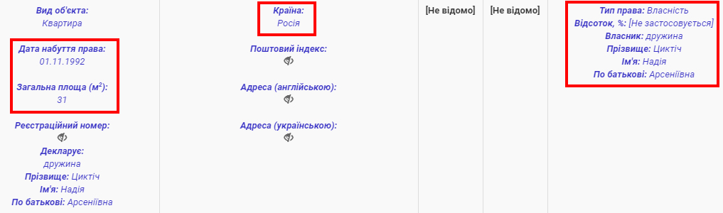Дружина Надія Циктіч володіє квартирою в Росії площею 31 кв. м, але без вказівки міста знаходження.