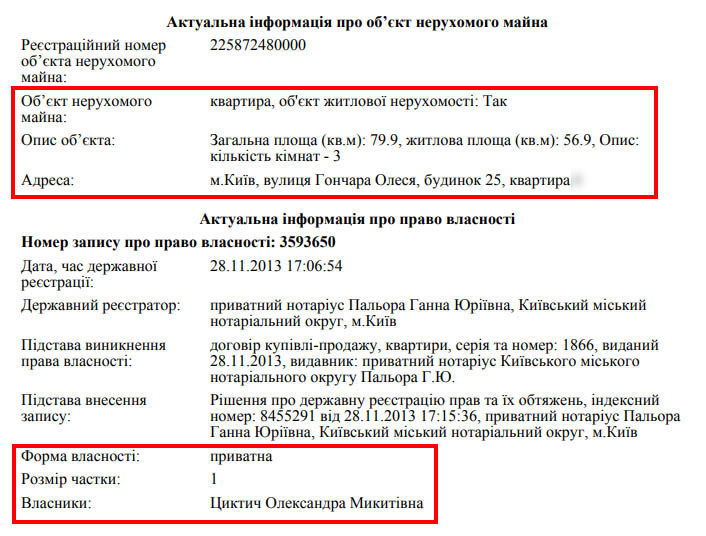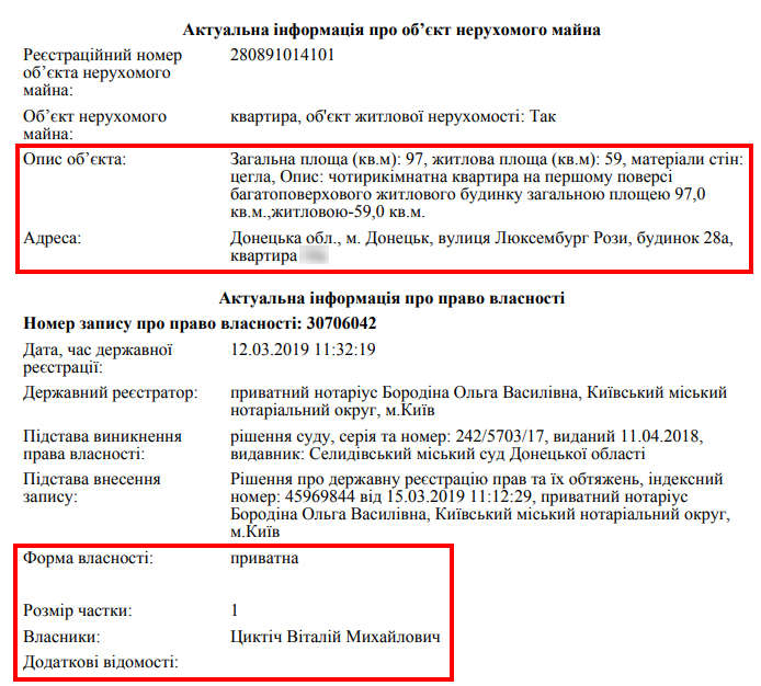 Звідки ж взялася ця квартира? Віталію Циктічу вона належала на підставі свідоцтва про право власності, виданим Головним управлінням благоустрою та комунального обслуговування Донецької міської ради від 2012 року.
