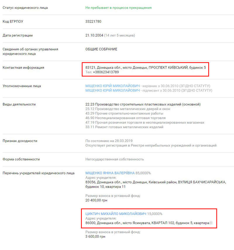 За відомостями реєстру юридичних осіб, батько Циктич Михайло Миколайович є співзасновником фірми з донецькою пропискою ТОВ "Фірма "Віконний двір" разом з Міщенко Яніною Валеріївною. Директором товариства значиться Юрій Міщенко, із яким судився за квартиру Віталій Циктіч. За підсумками 2014 року юридична особа працювала у збиток.