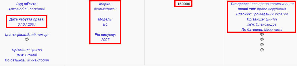 Станом на 2018 рік у розпорядженні суддівської родини був єдиний автомобіль Volkswagen B6, записаний на матір Циктіч Олександру з 2007 року. Задекларована вартість автівки – 160 000 грн.
