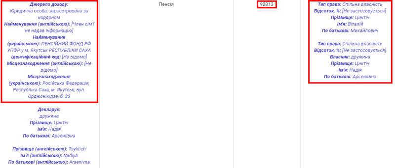 Ми проаналізували відкриті декларації Віталія Циктіча за 2014, 2015, 2016, 2017 та 2018 роки. Протягом цього часу суддя декларував переважно власну суддівську винагороду, яку ділить з дружиною Надією Циктіч. Вона є громадянкою Росії та у 2017 році отримала виплат від Пенсійного фонду РФ на 92 813 грн. У 2018 виплати в Росії підвищили і за підсумками року дружина судді отримала аж на 1 310 більше, тобто 94 123 грн.