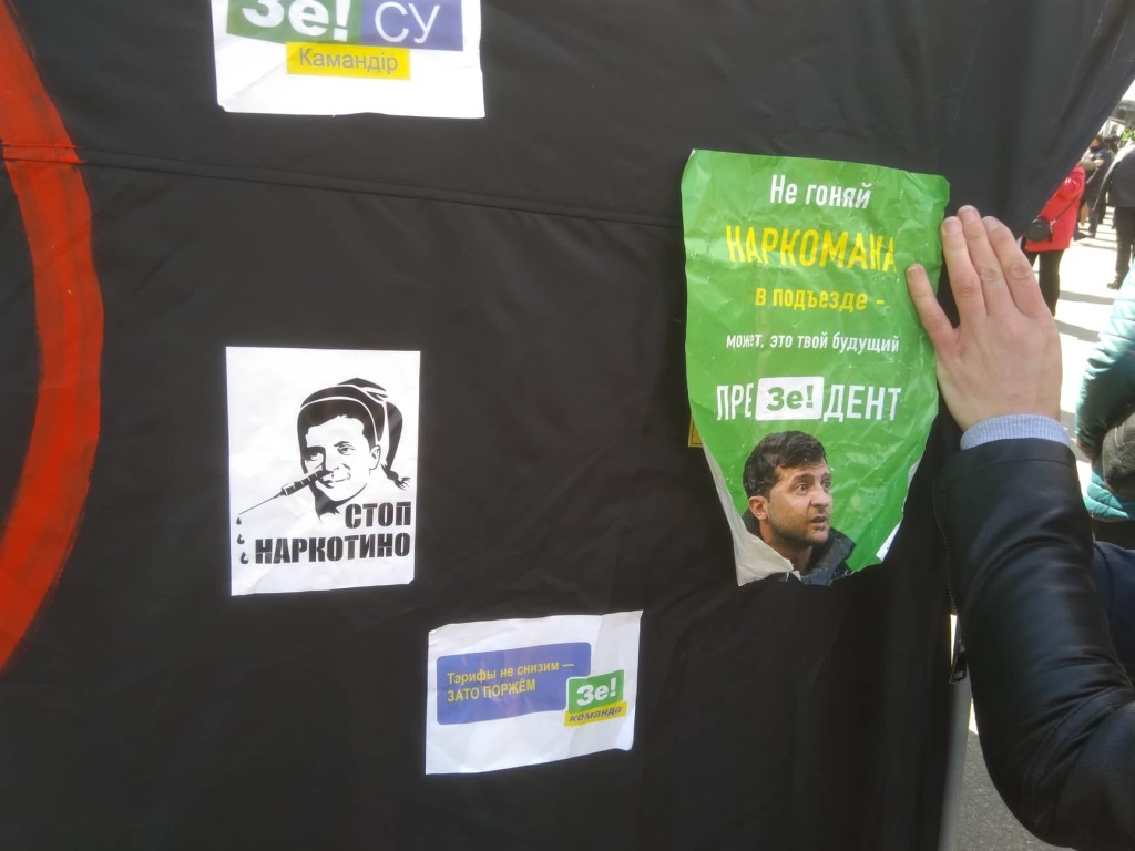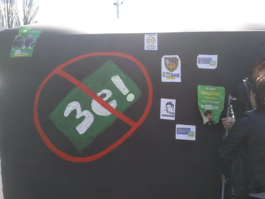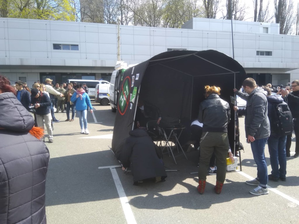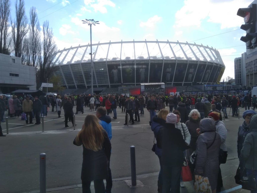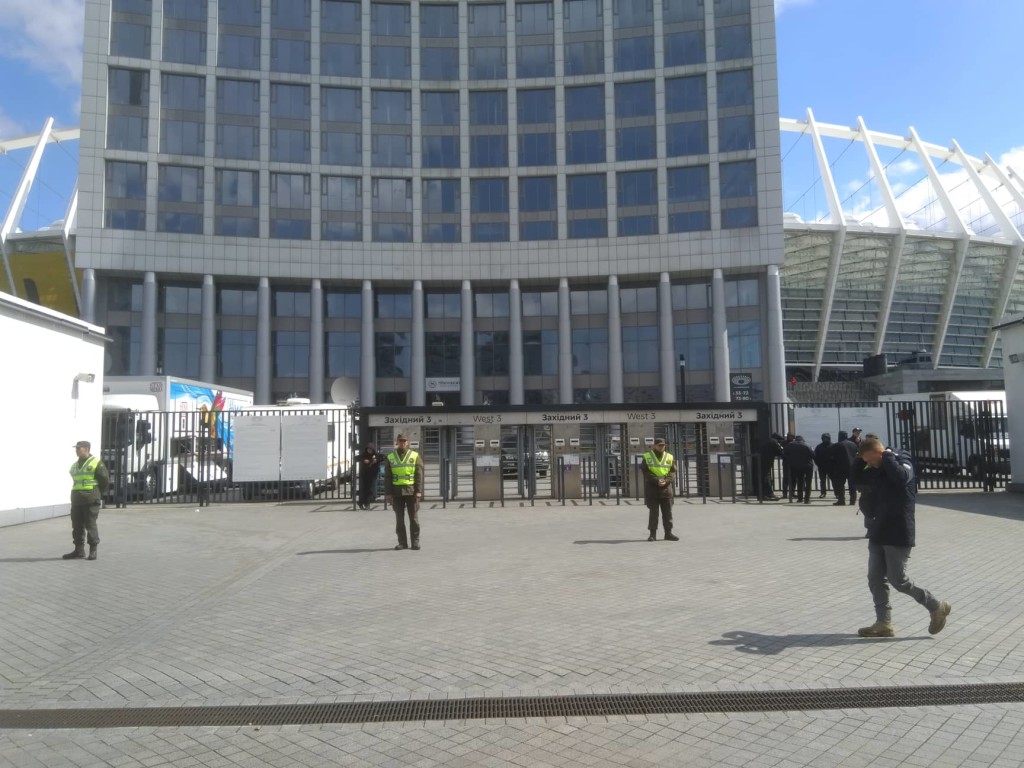 У НСК «Олимпийский» пока не работают металлоискатели, людей не запускают на территорию. Собрался митинг за кандидата в президенты П.Порошенко – около 200 человек. Люди стоят с агитационными плакатами. Установлена палатка с агит-продукцией, сцена.