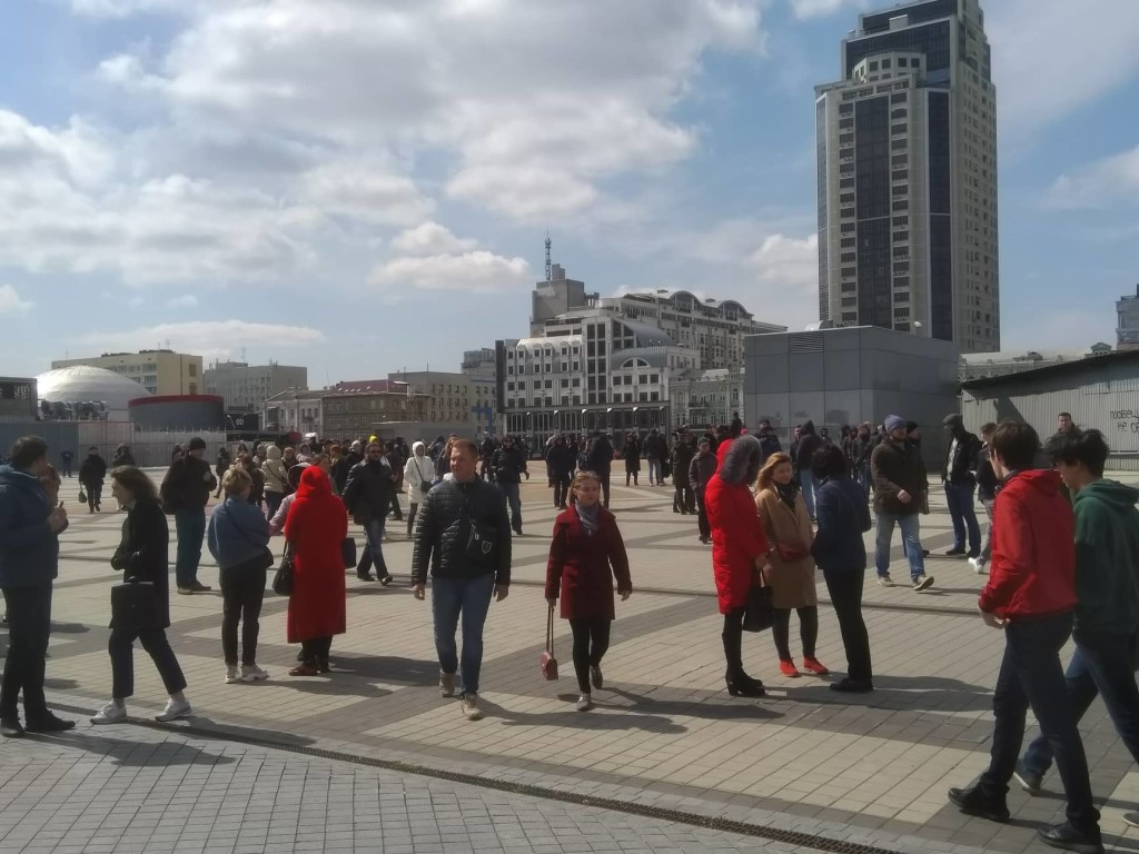 Люди группами выходят из метро, они направляются к НСК «Олимпийский». Учет людей ведут по спискам. Автобусов с людьми нет. На вид - идут люди пожилого и среднего возраста. Некоторые из них - со списками, подходят к людям, и уточняют, из какого они района прибыли. Сюдя по всему, это бюджетники.