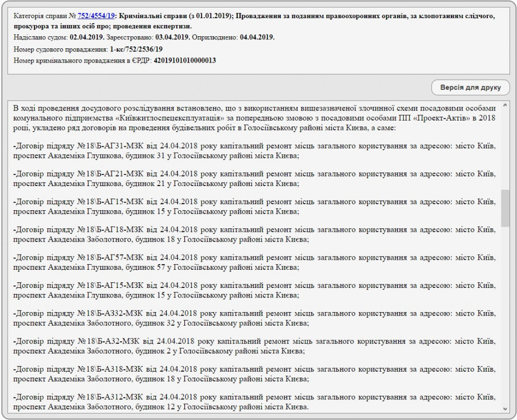 Правоохранителям стало известно, что 24 апреля 2018 года КП “Киевжилспецэксплуатация” и ЧП “Проект-Актив” (**) заключили 8 договоров на выполнение капитальных ремонтов мест общего пользования в 8 многоэтажках в Голосеевском районе. Речь идет о зданиях на проспекте Академика Глушкова (№№ 15, 21, 31, 57) и проспекте Академика Заболотного (№№ 2, 12, 18, 32). Общая сумма договоров составила 5,08 млн гривен.