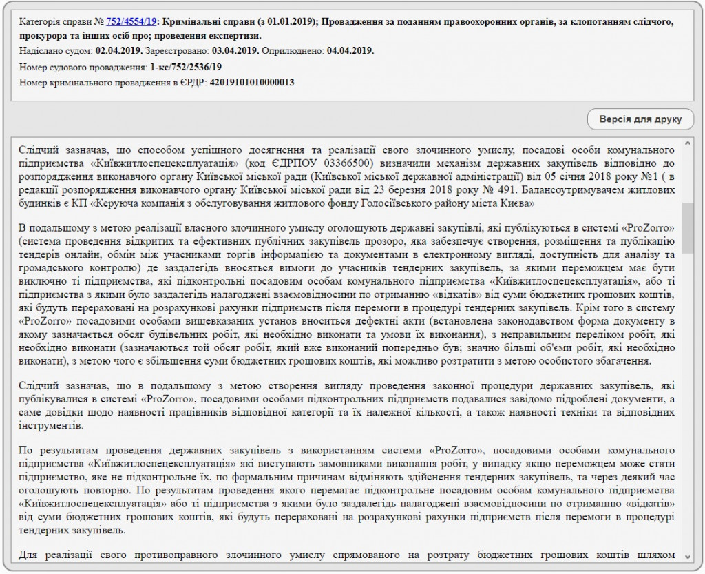Так, согласно материалам дела, должностные лица КП “Киевжилспецэксплуатация” объявляют в системе “ProZorro” торги. Победителями должны быть исключительно те предприятия, которые подконтрольны руководству указанного коммунального предприятия, или те фирмы, с которыми были заранее “построены” взаимоотношения по получению “откатов”. Участники тендеров вносят в систему “ProZorro” дефектные акты с неправильным перечнем работ, которые необходимо выполнить. Это якобы делается для “увеличения суммы бюджетных денежных средств, которые можно растратить в целях личного обогащения”.
