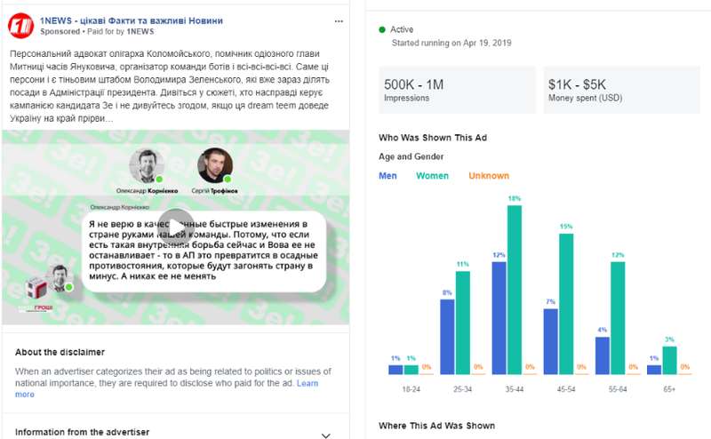 Гражданское движение “Чесно” сообщает, что в день выборов зафиксировал в Фейсбуке рекламу в пользу и против команды Зеленского.
